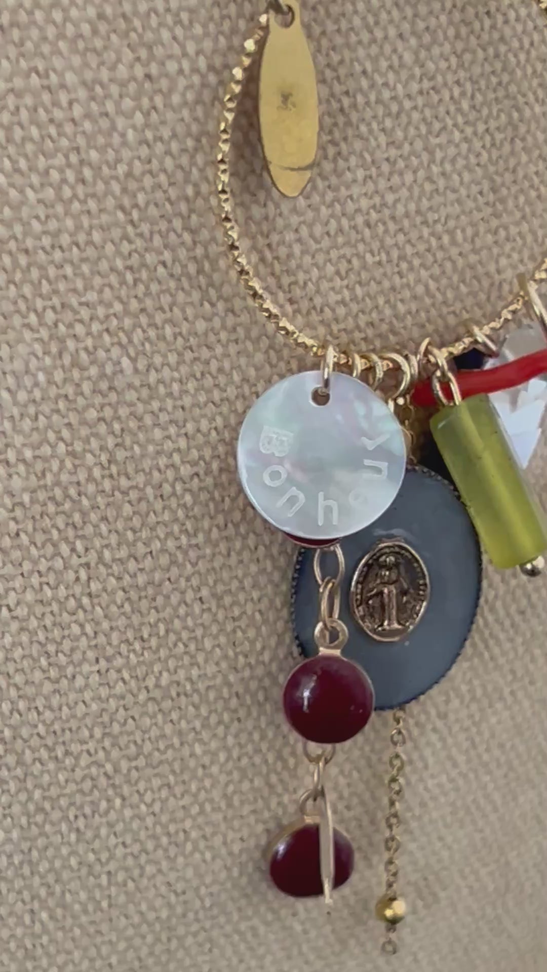 Collana lunghezza media realizzata in acciaio allergico E inossidabile con Ring martellato impreziosito con Mix di charm fra cui madreperla con inciso bonheur, pietre dure e mix di catene
